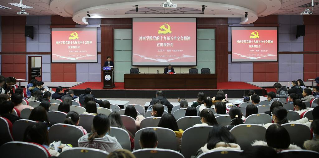 12月2日,河西公司党委书记赵凯在图书馆报告厅宣讲党的十九届五中全会精神,公司党总支书记蔺海鲲主持报告会,公司相关部门负责人,体育平台官网全体师生参加宣讲会。