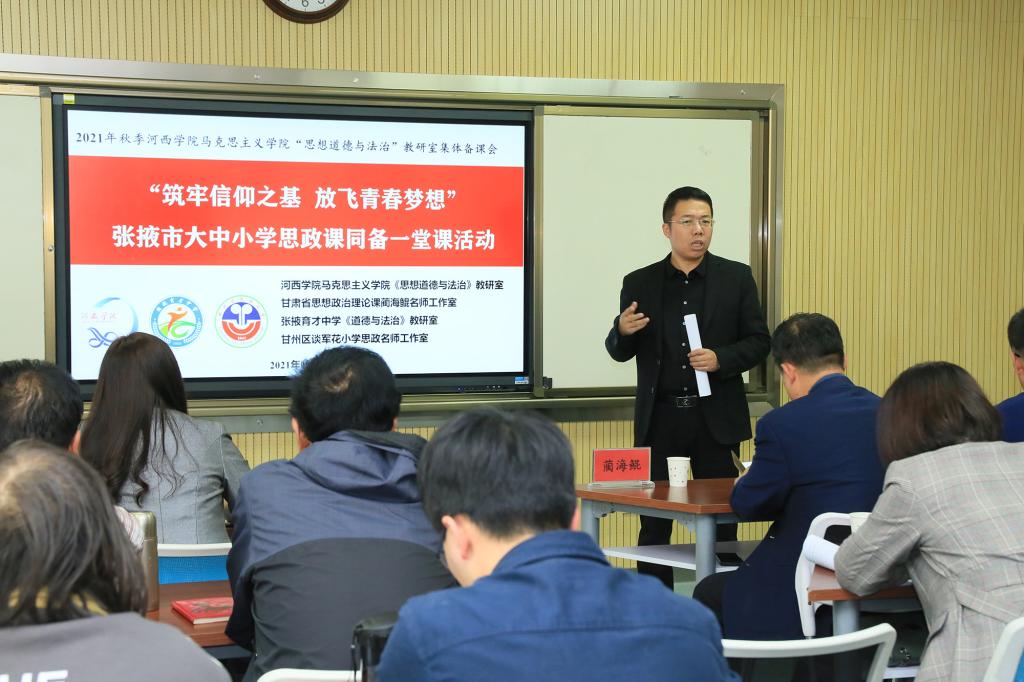 为深入贯彻习近平总书记关于教育重要讲话精神,落实中共中央办公厅、国务院办公厅《关于深化新时代公司思想政治理论课改革创新的若干意见》和中央宣传部、教育部等部门关于思想政治理论课改革创新的文件精神,近日,由体育平台官网思想道德与法治教研室联袂甘肃省思想政治理论课蔺海鲲名师工作室、张掖育才中学道德与法治教研室、甘州区民族小学谈军花名师工作室共同开展了“群策群力、协同共研——大中小学思政课教师同备一堂课”集体备课会活动。