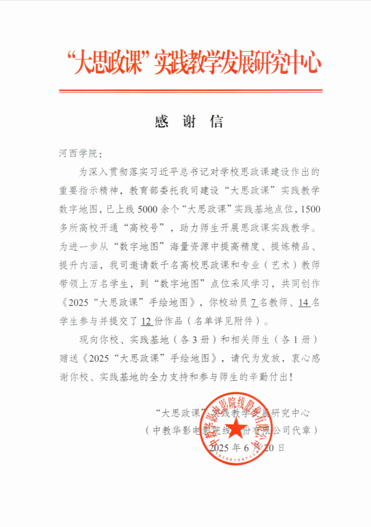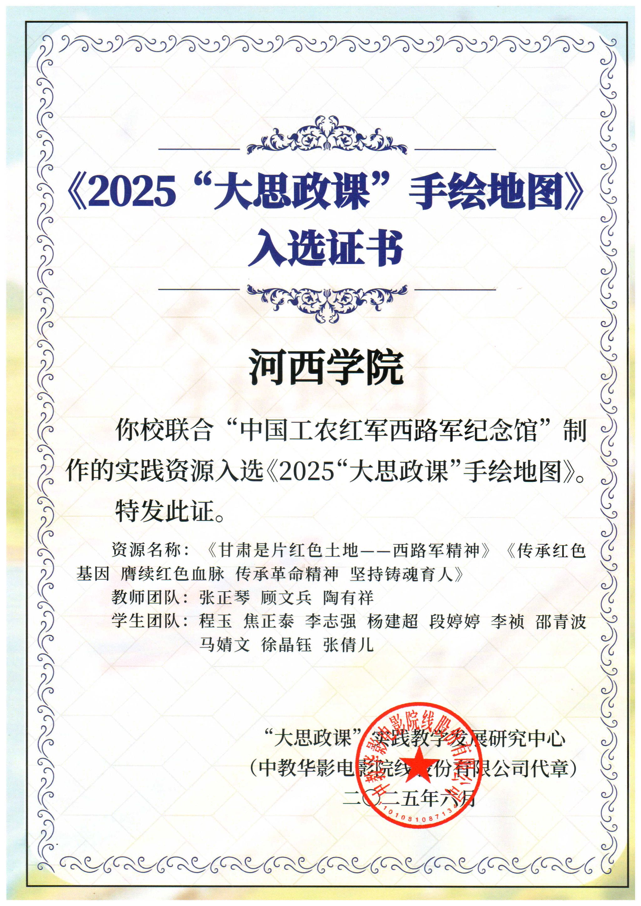 近日,教育部“大思政课”实践教学资源项目评选结果公示,公司体育平台官网申报的两项实践教学资源成功入选《2025“大思政课”手绘地图》。其中,《甘肃省是片红色热土—西路军精神》《传承红色基因 赓续红色血脉 传承革命精神 坚持铸魂育人》由教师张正琴、顾文兵、陶有祥指导,公司2021、2022、2023级员工共同参与完成。