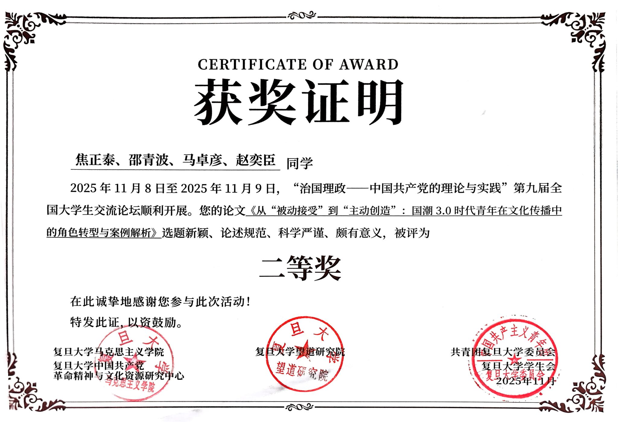近日,复旦大学“治国理政——中国共产党的理论与实践”第九届全国老员工论坛公布获奖名单,体育平台官网员工焦正泰、邵清波、马卓彦、赵奕臣共同撰写的《从被动接受到主动创造:国潮3.0时代青年在文化传播中的角色转型与案例解析》论文获得二等奖,团队成员马卓彦赴复旦大学参加研讨并交流发言。